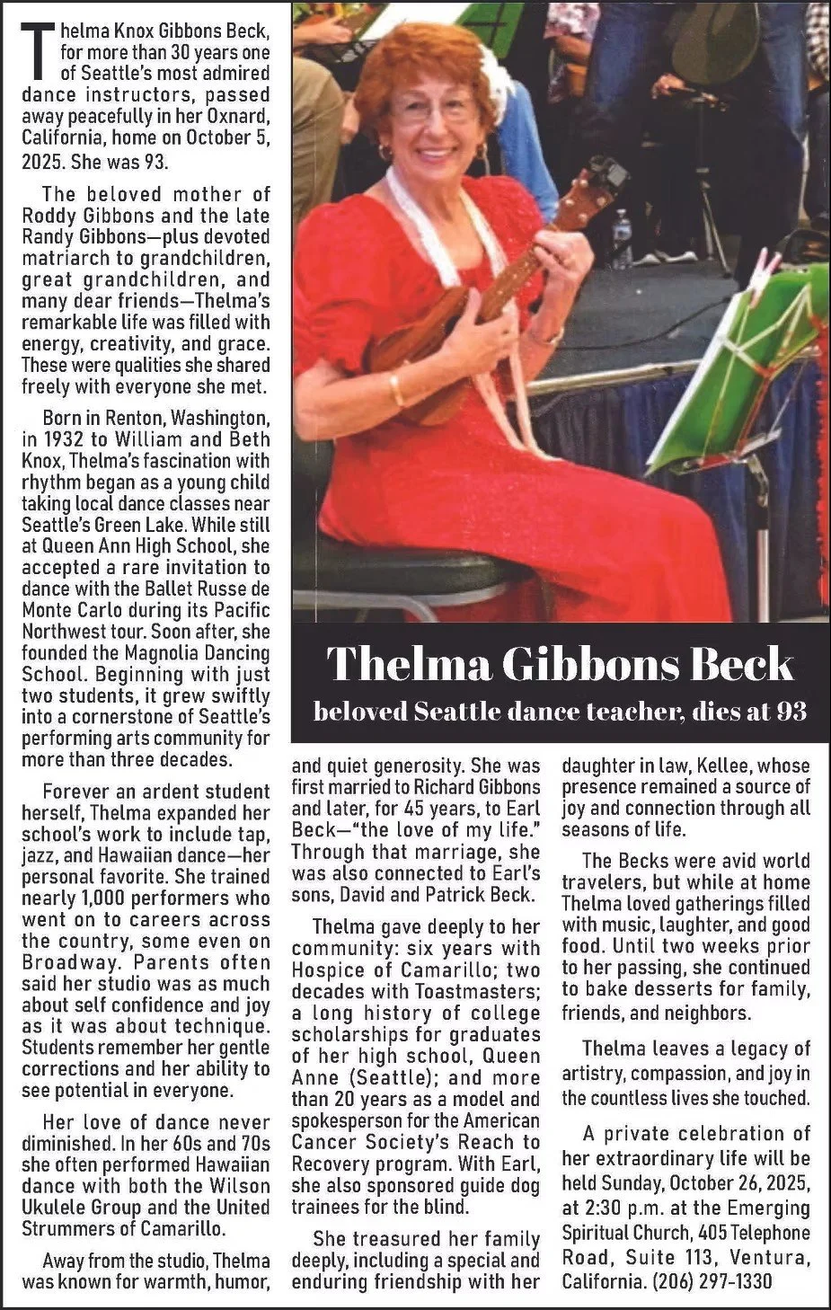 However, as you can see by one of the photos, she enjoyed tap dance. Thelma leaves a legacy of artistry, compassion, and joy in the countless lives she touched.